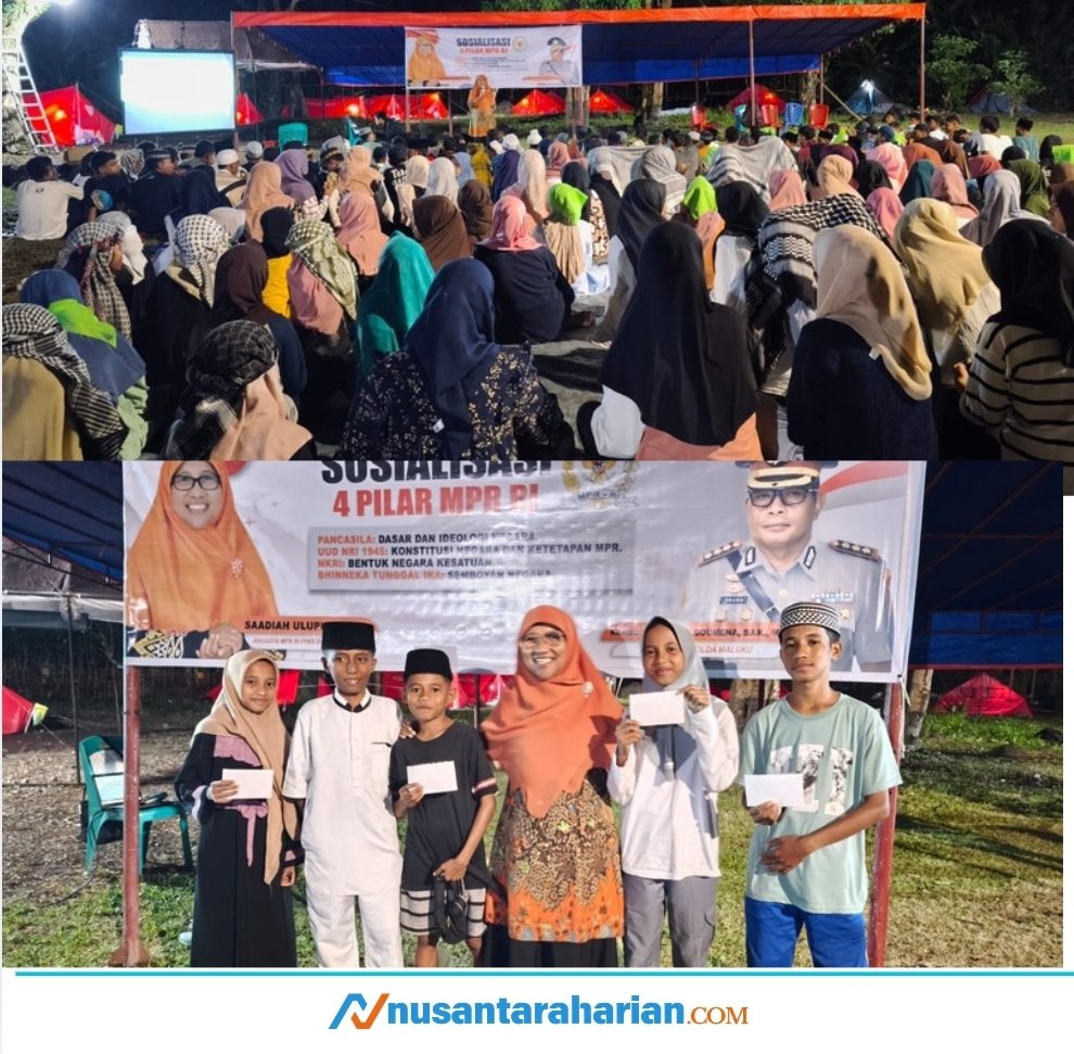Leihitu,Maluku,Nusantaraharian.com – Anggota MPR RI Daerah Pemilihan Maluku, Saadiah Uluputty, ST, melaksanakan Sosialisasi Empat Pilar Kebangsaan kepada pelajar SD, SMP, dan SMA di Negeri Lima, Kecamatan Leihitu, Kabupaten Maluku Tengah, yang tengah mengikuti kegiatan Kemah Religi Pelajar, Pada Selasa, 9 Desember 2025.